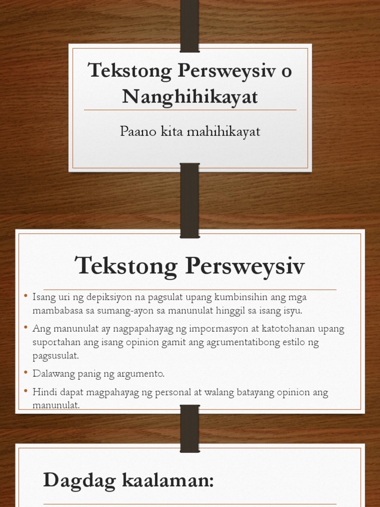 TEXTONG NANGHIHIKAYAT O PERSWEYSIV Layunin ng textong persweysiv na maglahad ng isang opinyong kailangang mapanindigan at maipagtanggol sa tulong ng mga patnubay at totoong datos upang makumbinsi ang mga mambabasa na pumanig sa manunulat. We are here to get in touch with a relevant expert so that you can complete your work on time. Halimbawa ng tekstong persweysiv tungkol sa produkto.