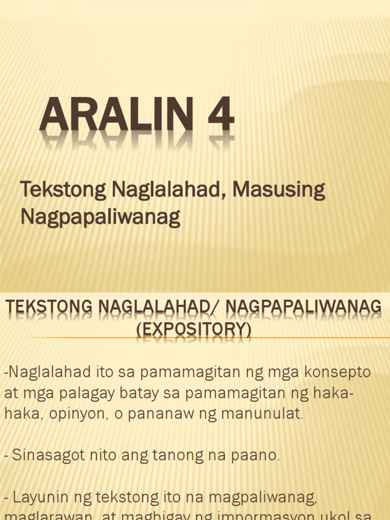 Maaring ang paksa ay tungkol sa isang konkretong bagay gaya ng katarungan pagkakapantay-pantay o pag-ibig sa ganitong uri ng tekstong impormatibo mahalagang pag-ibahin ang mga kahulugang denotatibo o konotatibo. Ito ay may layunin na sumagot sa tanong na paanopaano binuo paano iluto paano buuin paano gawin paano nangyari at iba pang mga gawain at pangyayaring lagi nating ikinakabit. Tekstong Naglalahad Ekspositori Masusing Nagpapaliwanag Ikatlong Pangkat I.