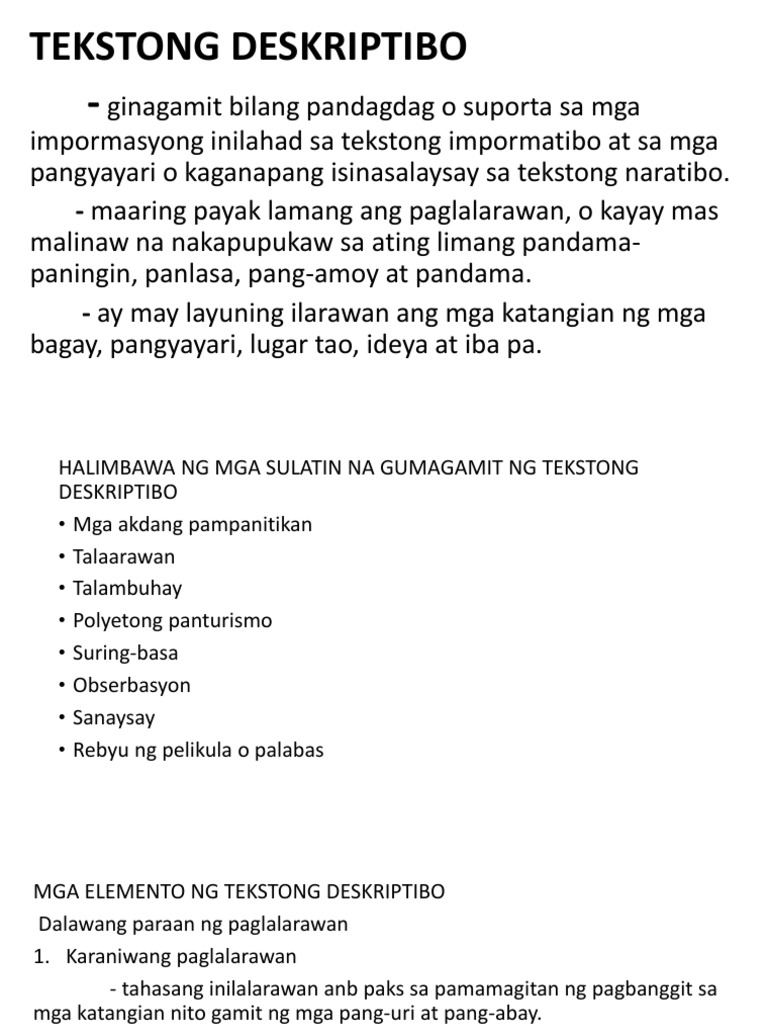 Ito ay naglalaman ng mga impormasyong may kaugnayan sa mga katangian ng tao bagay lugar at pangyayaring madalas nasasaksihan ng tao sa paligid. Gumagamit ng mga pang-uri adjectives at pang-abay adverb sa paglalarawan. Ang tekstong deskriptibo ay uri ng paglalahad at ginagawa sa gamit ang mahusay na eksposisyon.